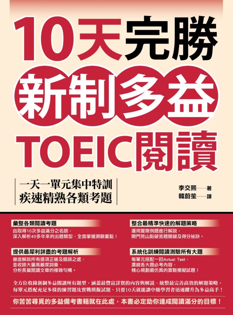 在全球化與國際競爭日益激烈的今天,TOEIC 已不僅是一項英語能力檢測,更是求職、升遷、海外工作與學術深造的重要通行證。對於多數考生而言,閱讀測驗的難度與壓力往往不在於單字或文法知識的匱乏,而在如何於有限時間內,迅速準確地抓住題目核心,運用有效策略解出正確答案。這正是《10天完勝新制多益TOEIC閱讀:一天一單元集中特訓,疾速精熟各類考題》最令人期待與信賴的地方它不只是一本題庫,而是一套完整、精準、實用的解題指南。