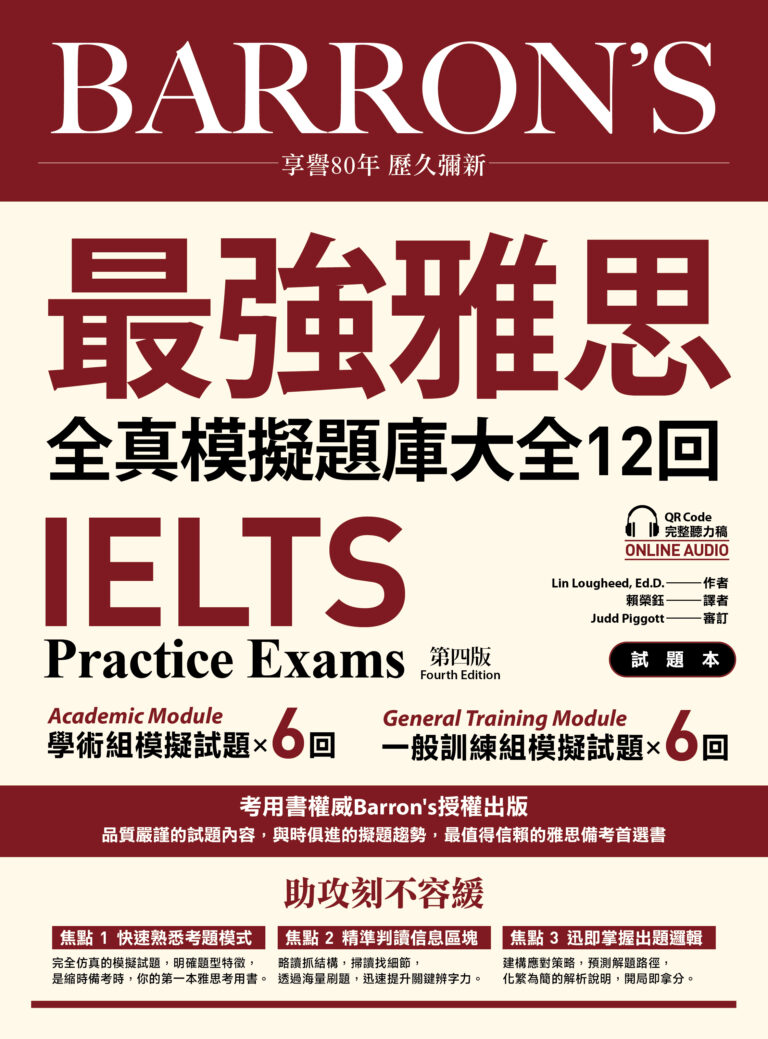 Barron’s Educational Services成立超過80年,與時俱進的快速更新以因應不斷改變的考試內容,深受全球需要取得證照及語言檢定的考生信賴,是初次備考雅思的首選書籍。